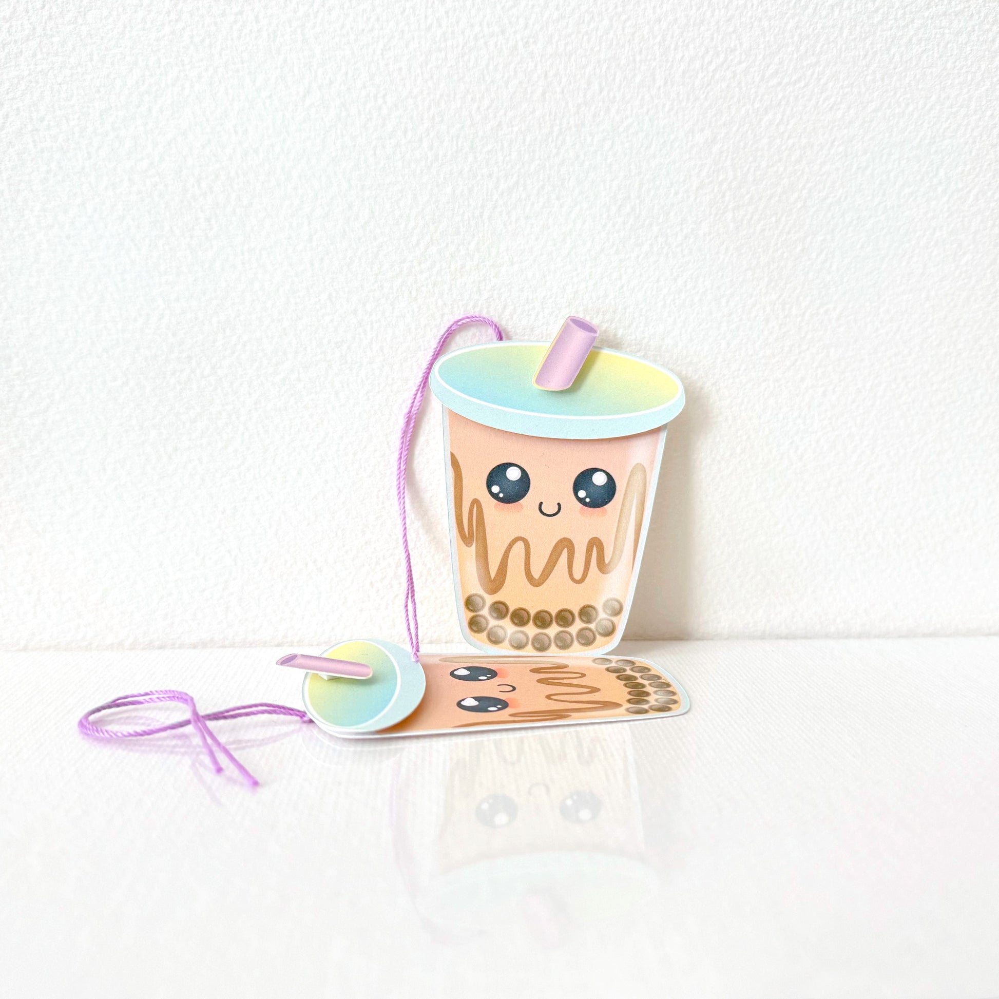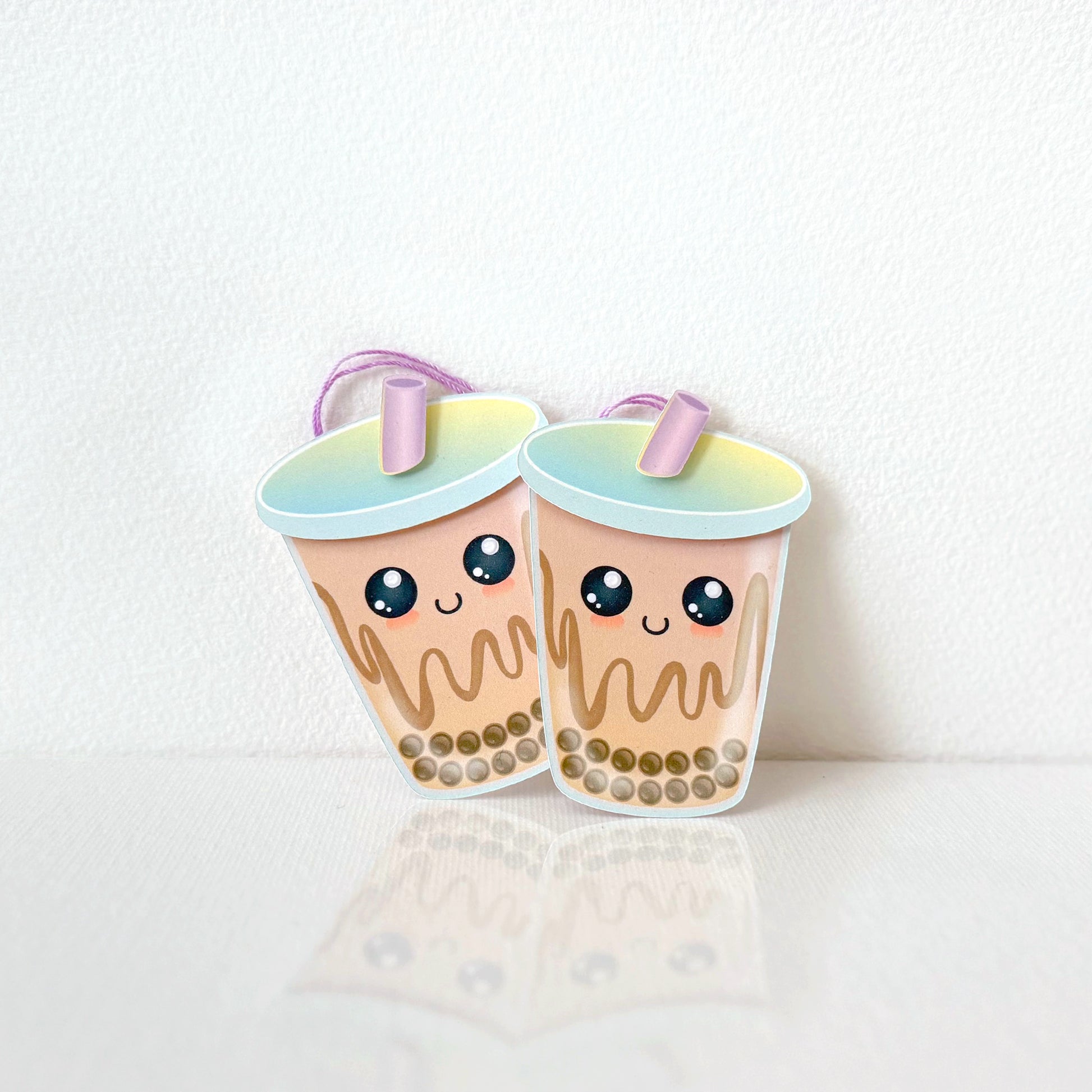This listing is for a set of Boba Tea Tags. These are great for presents, favors, treat bags, and more. These are tea-shaped tags with a layered lid & straw. The eyes also have a iridescent pearl dot to give them a little dimension. The back left blank so it can be written on. The tag comes with a braided string so you can hang it or attach it to whatever you'd like!