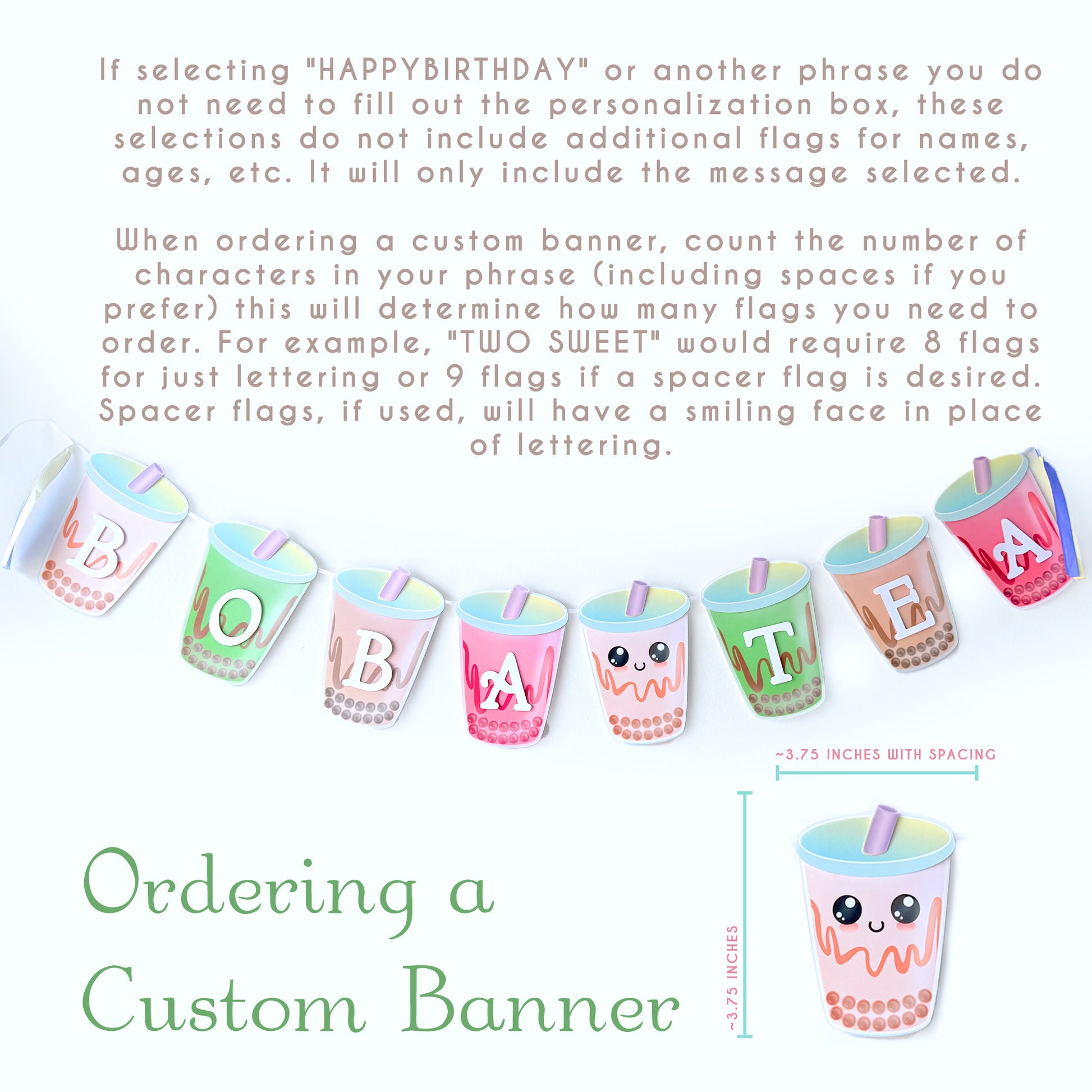 This banner features a boba tea theme with various colors for the drinks available! If spacer flags are used in between words, the cup has an adorable little smile in place of the letter. It is strung together with white ribbon and has yellow and purple ribbon at the ends. Select the number of flags you need and include the phrase you want it to spell out under "personalization"! Don't forget to include spacer flags for spaces in your count if desired! The banner comes by default with alternating colors as shown, if you'd like it all a single color or a particular mix, please include it with your personalization details.