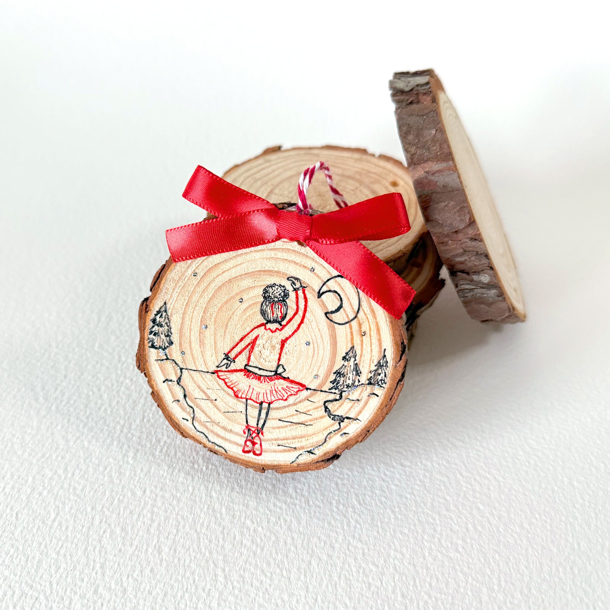 This wood slice holiday ornament is hand drawn on pine wood slices that have been kiln dried. Each one is carefully drawn in red and black ink then finished with a touch of glitter. It is hung with red and white string and has a satin red bow at the top.