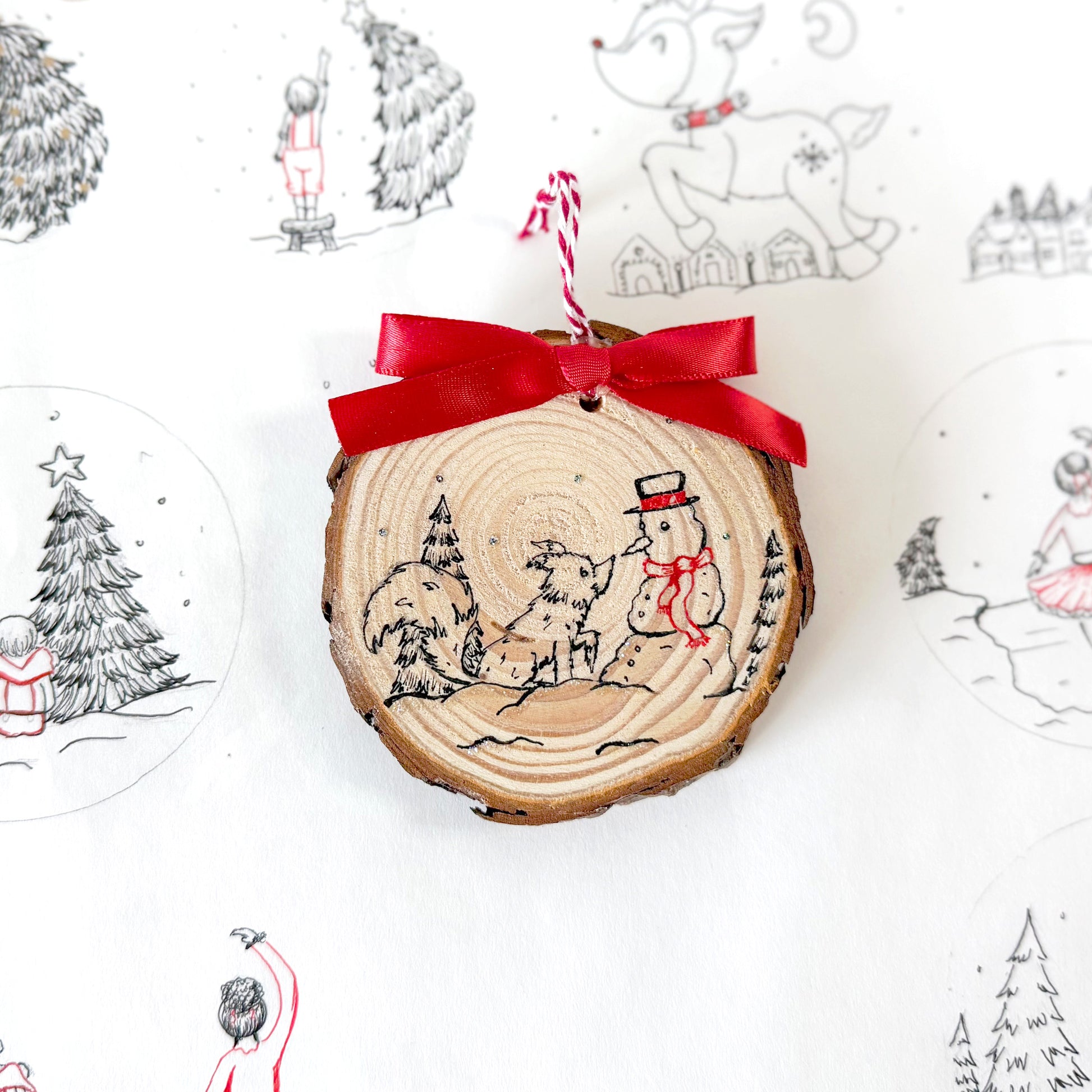 This wood slice holiday ornament is hand drawn on pine wood slices that have been kiln dried. Each one is carefully drawn in red and black ink then finished with a touch of glitter. It is hung with red and white string and has a satin red bow at the top.
