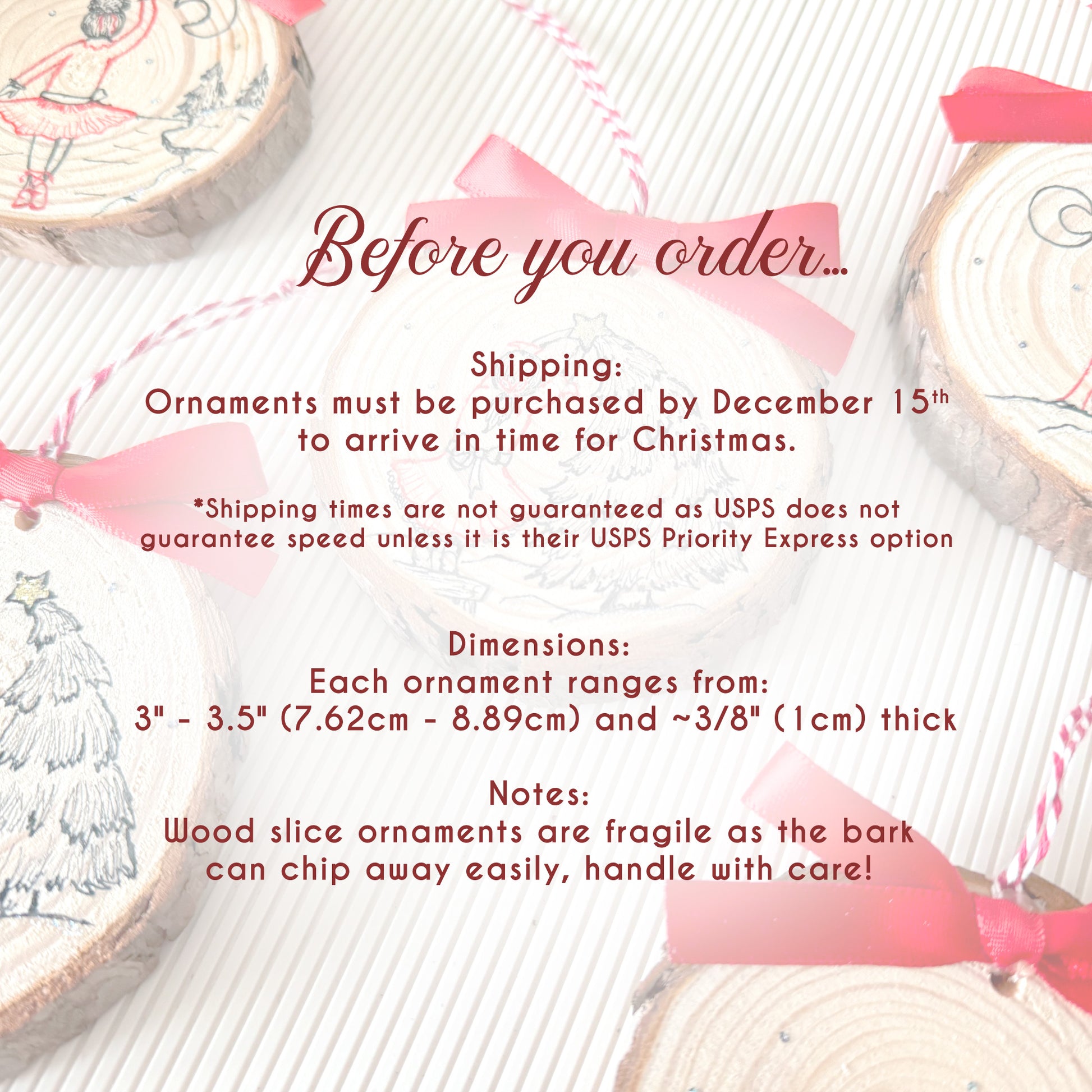 • Dimensions: Each ornament ranges from 3" - 3.5" (7.62cm - 8.89cm) and ~3/8" (1cm) thick
